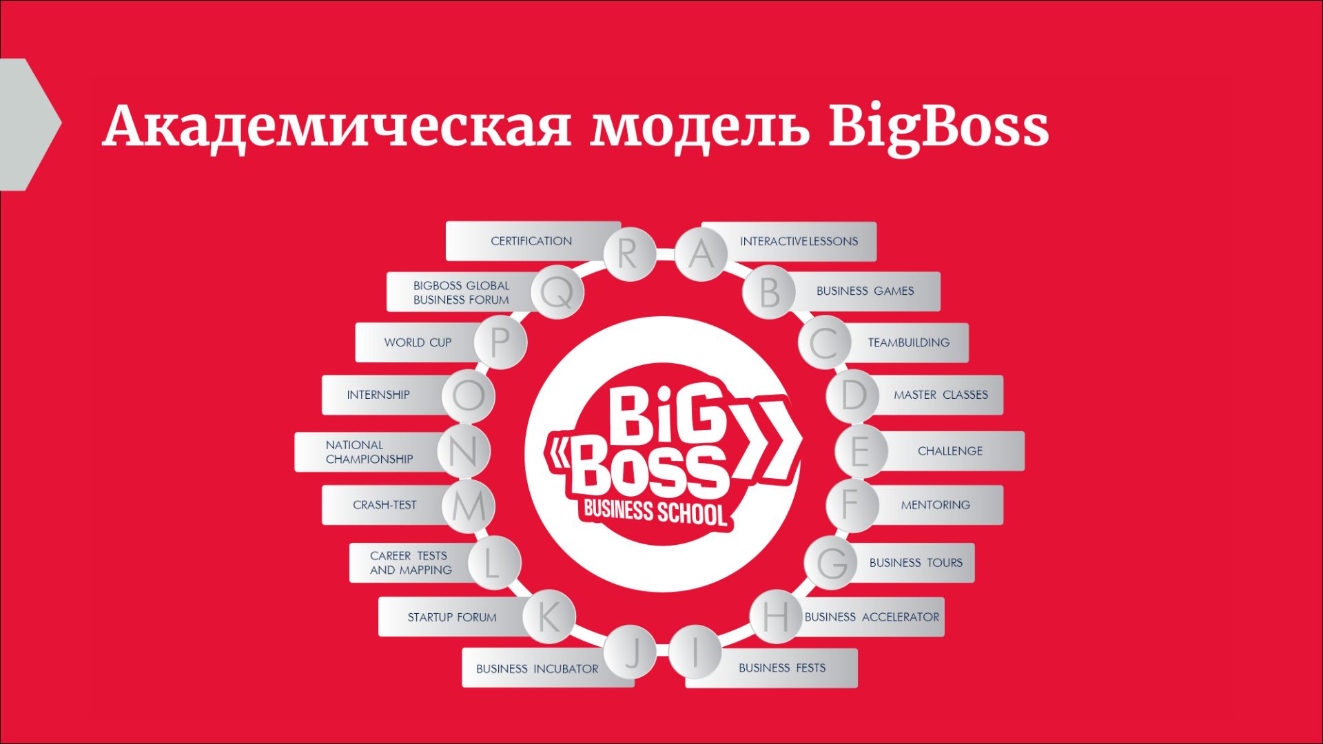 Методологию BIGBOSS мы рассматриваем как теоретическую часть, где формируется идеальная образовательная модель, и как практическую часть, ориентированную на решение практических проблем и целенаправленное преобразование мира через воспитание нового поколения предпринимателей (программа, алгоритм, набор приёмов и способов того, как достичь желаемой практической цели).